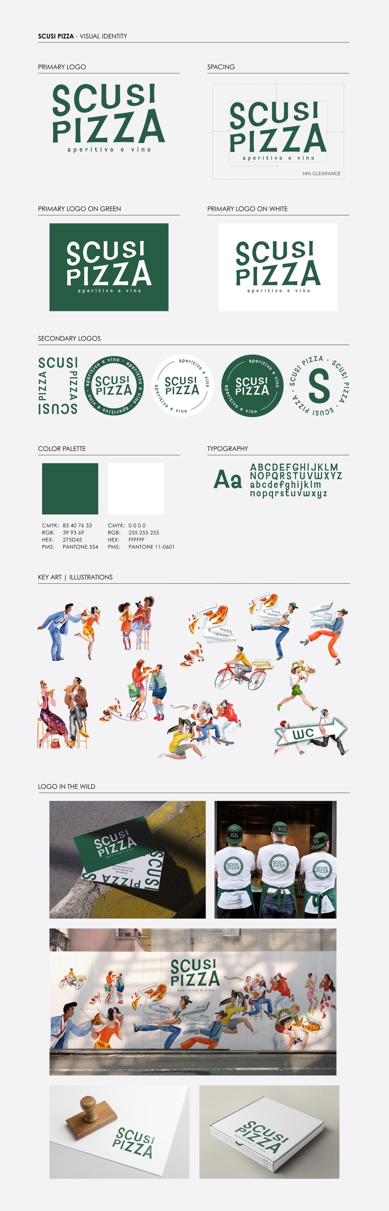 Develop a playful yet refined visual identity that balances the casual neighborhood vibe with the sophistication brought by Michelin-starred chef Laurent Tourondel. An illustrator was hired to create a custom scene featuring lively characters enjoying pizza, drinks, and treats, bringing the courtyard experience to life through art. The branding celebrates fresh ingredients, community gathering, and the spirited charm of Scusi’s setting.
